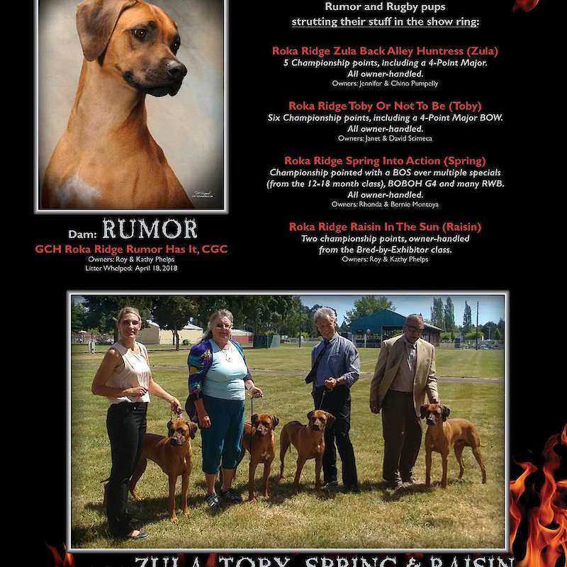 Roka Ridge Spring Into Action, offspring of GCH CH Roka Ridge Rumor Has It CGC and GCHP CH Diablo's Back Alley Brawler CGC.